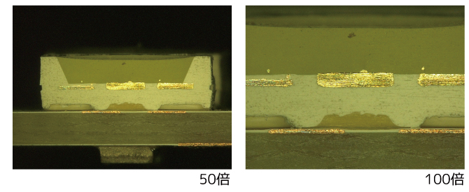 ダレや傷なく切断され、樹脂や銅等、それぞれの材料の界面がはっきりと確認でき、綺麗に切断できています。