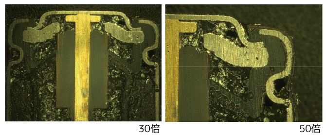 隣り合った不良リードフレームをそれぞれ違った手法(断面と平面など)で解析を行う場合、切り分けて手法に適した試料作製を行う必要があります。