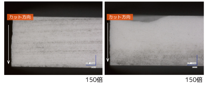 硬さの異なる試料でもそれぞれの材料を綺麗に切断することが可能です。