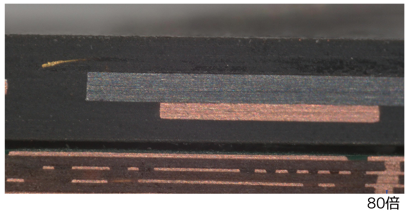 ダレや傷なく切断され、樹脂や銅等、それぞれの材料の界面がはっきりと確認でき、綺麗に切断できています。