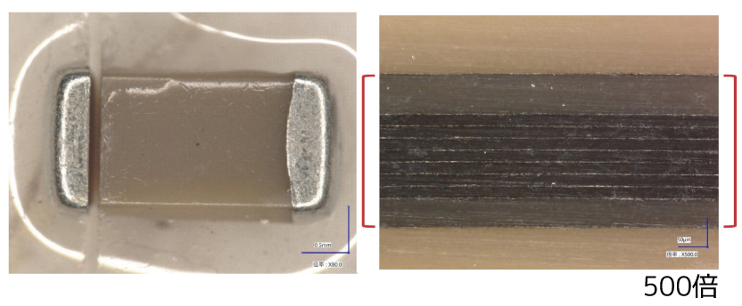 積層セラミックチップコンデンサの研究開発や品質保証の現場において、精密切断と高い位置合わせ精度を両立したLUKUONは強力なツールとなります。小さな積層セラミックスコンデンサの外部電極とセラミックの界面を正確に狙い切りができます。積層構造を崩さずに断面出しが可能です。