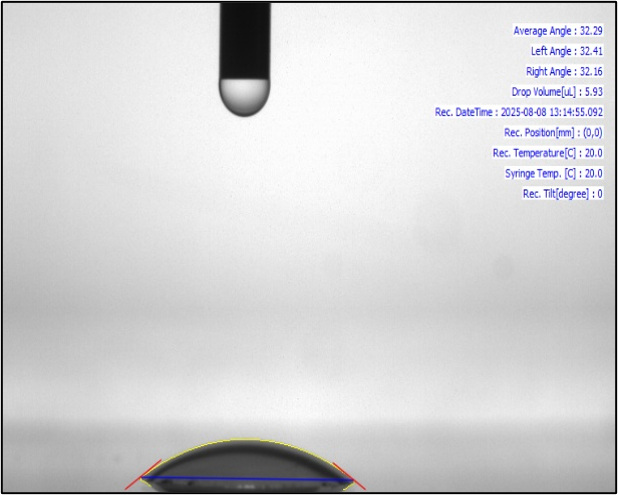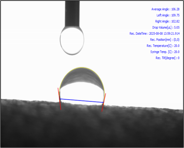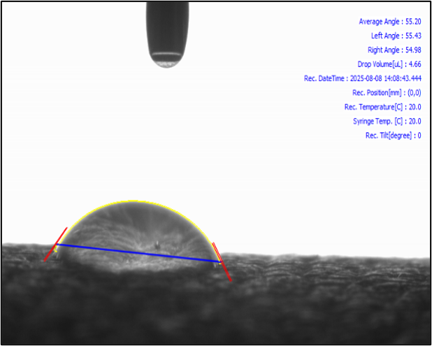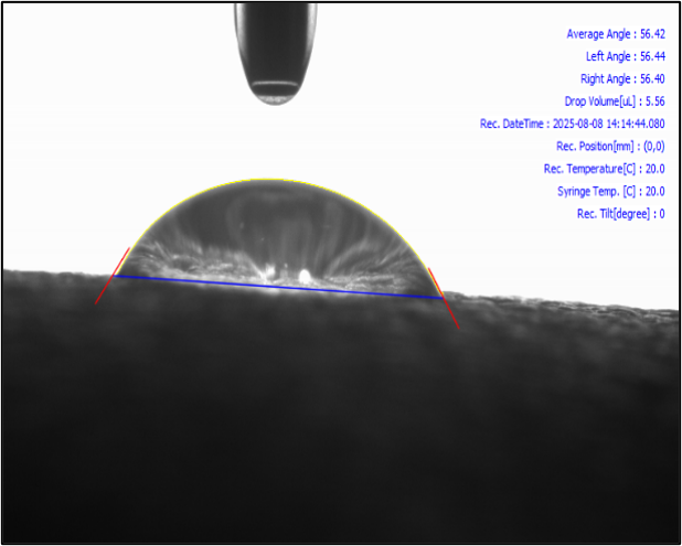 接触角が小さい結果となりました(接触角の小ささは表面張力の低さを示唆します)。
