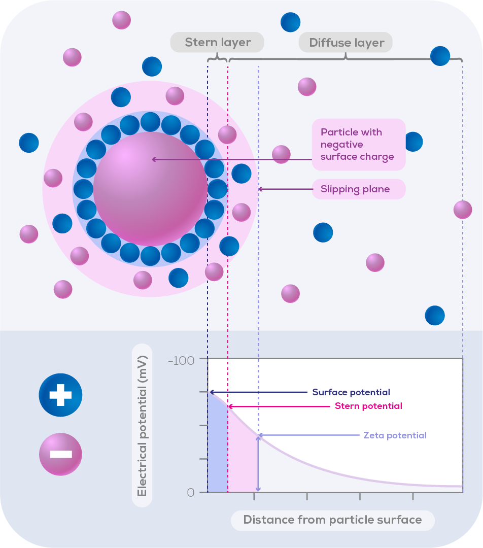 ゼータ電位は、粒子表面の電気二重層における「滑り面(slipping plane)」の電位として定義され、粒子同士の静電的な反発力または引力の大きさを示します。この値は、粒子が凝集するか、安定して分散するかを判断する上で重要な情報となります。