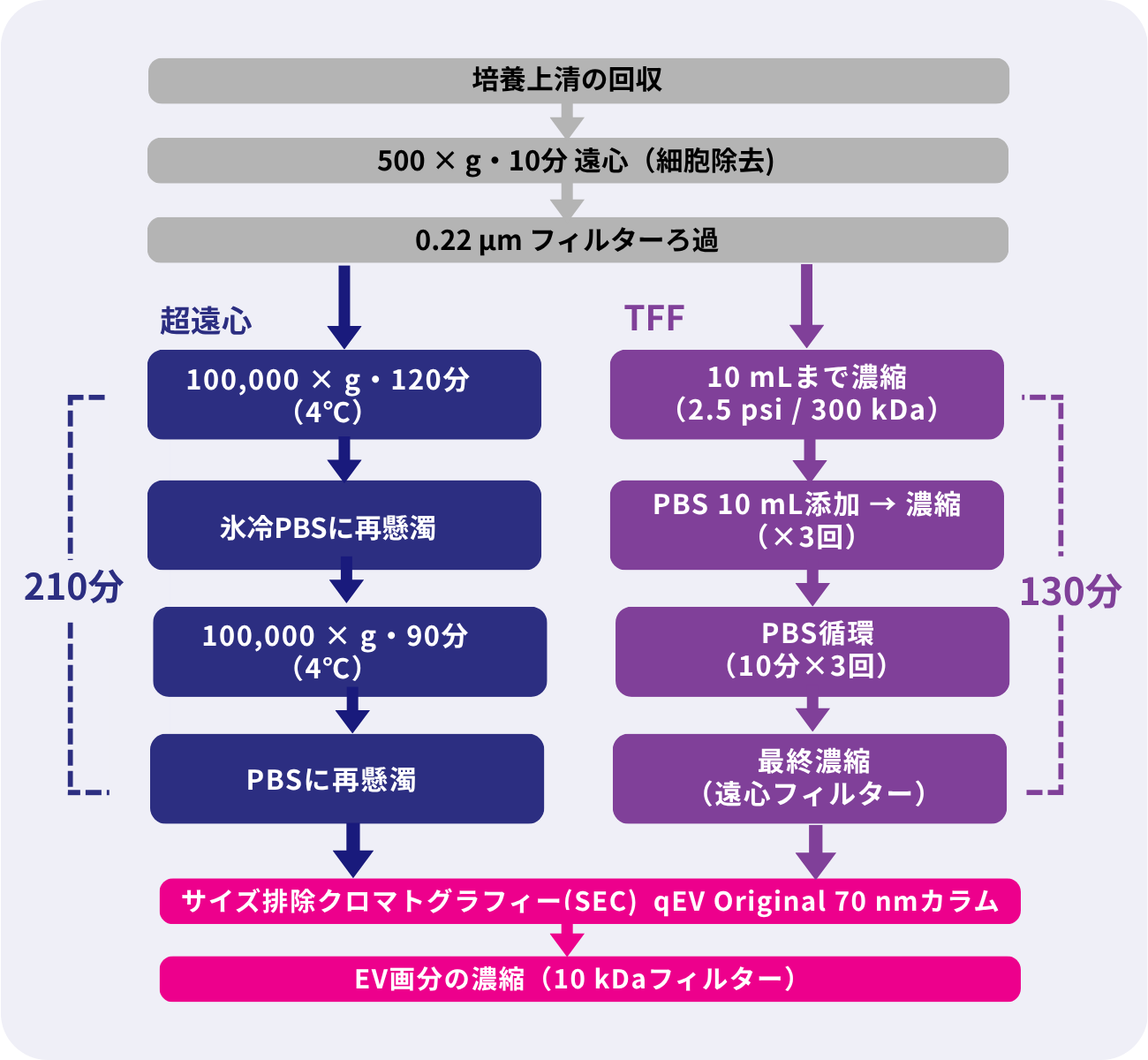 💡 濃縮処理方法:超遠心法では手技・再現性が課題ですが、TFFは誰でも再現性高く濃縮可能