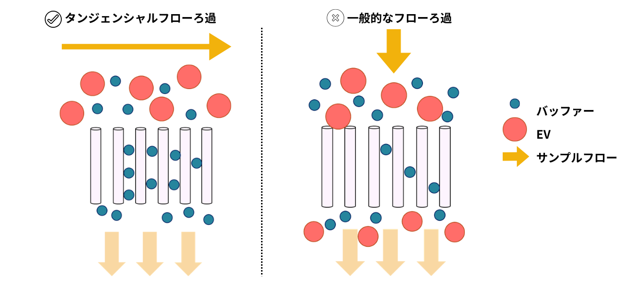 EVを傷つけない横方向フローで、バッファーだけを透過させる濃縮方式です。